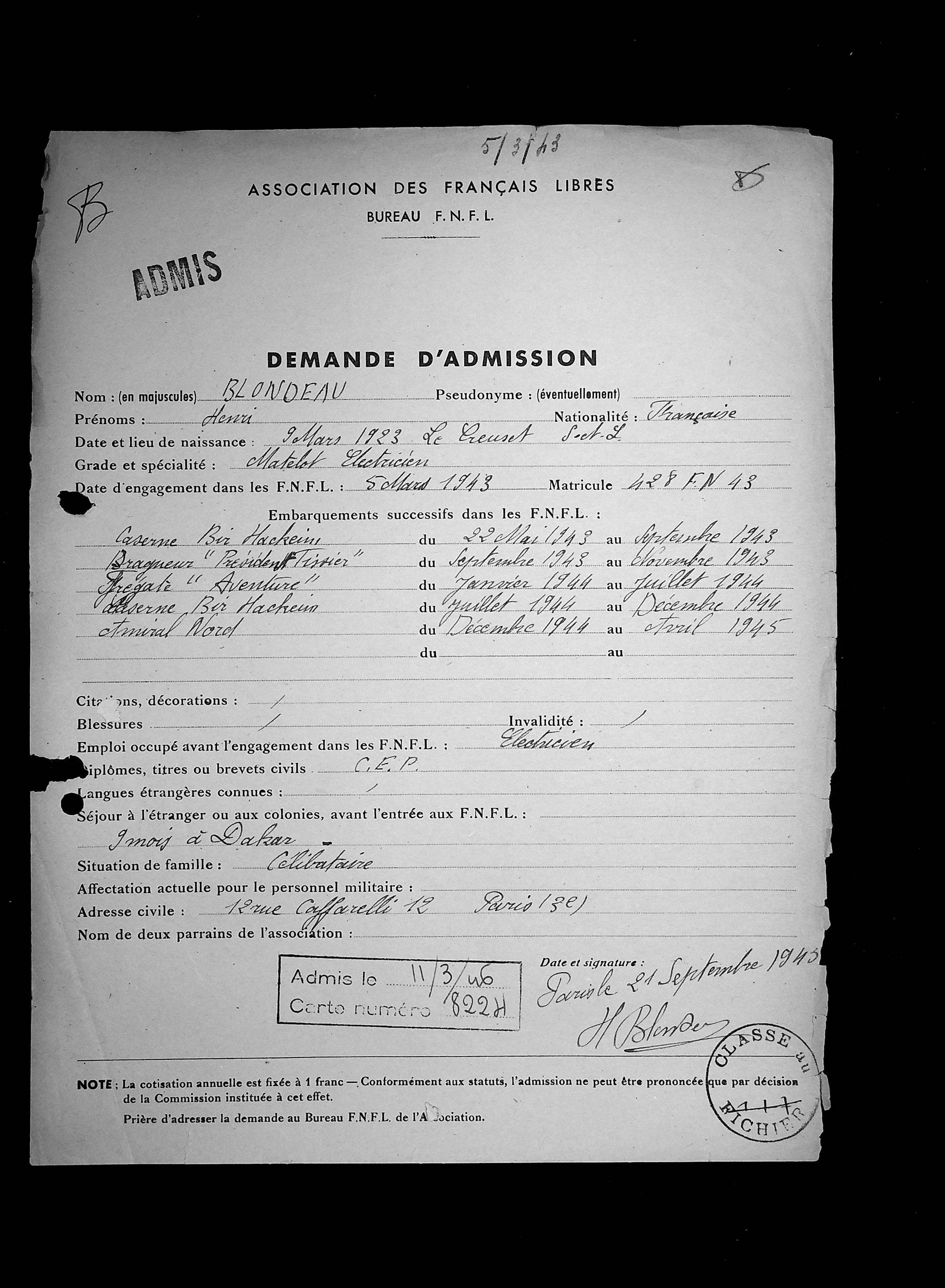Dans sa demande d'admission dans l'Association des Français libres après la guerre, Henri Blondeau indique s'être engagé dans les FNFL le 5 mars 1943. Il est probable que cette date soit celle de son ralliement, car le mémorial date son engagement du 24 mars.