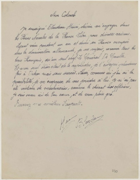 Après passage à l'école des électriciens de la Marine à Toulon, Henri Blondeau fut envoyé en 1942 à Dakar (Sénégal) pour embarquer sur le cuirassé Richelieu resté fidèle au gouvernement de Vichy.
