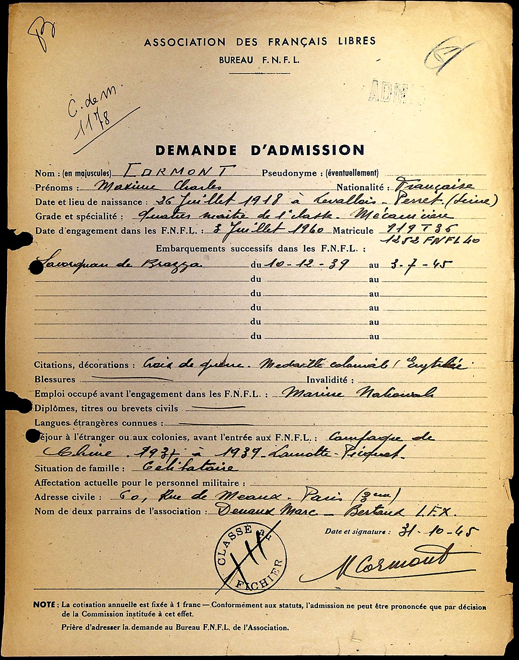 En décembre 1939, Maxime Cormont embarqua sur le Savorgnan de Brazza. Il était encore à bord de l'aviso colonial, lorsqu'il fut saisi par les Anglais le 3 juillet 1940 à Portsmouth (opération Catapult). Il choisit alors, comme environ la moitié de l'équipage, de rallier la France libre. Le Savorgnan de Brazza prit ou reprit armement à Portsmouth le 17 juillet 1940 et son journal de bord fut ouvert le 23 août. C'est sans doute au cours de ce réarmement que Maxime Cormont fut affecté à son ancien bâtiment. Officiellement, il est considéré comme ayant rallié la France libre dès le 3 juillet. Selon son état signalétique et des services, cette date serait aussi celle de son nouvel embarquement sur le Savorgnan de Brazza. Mais elle a sans doute un caractère purement administratif.