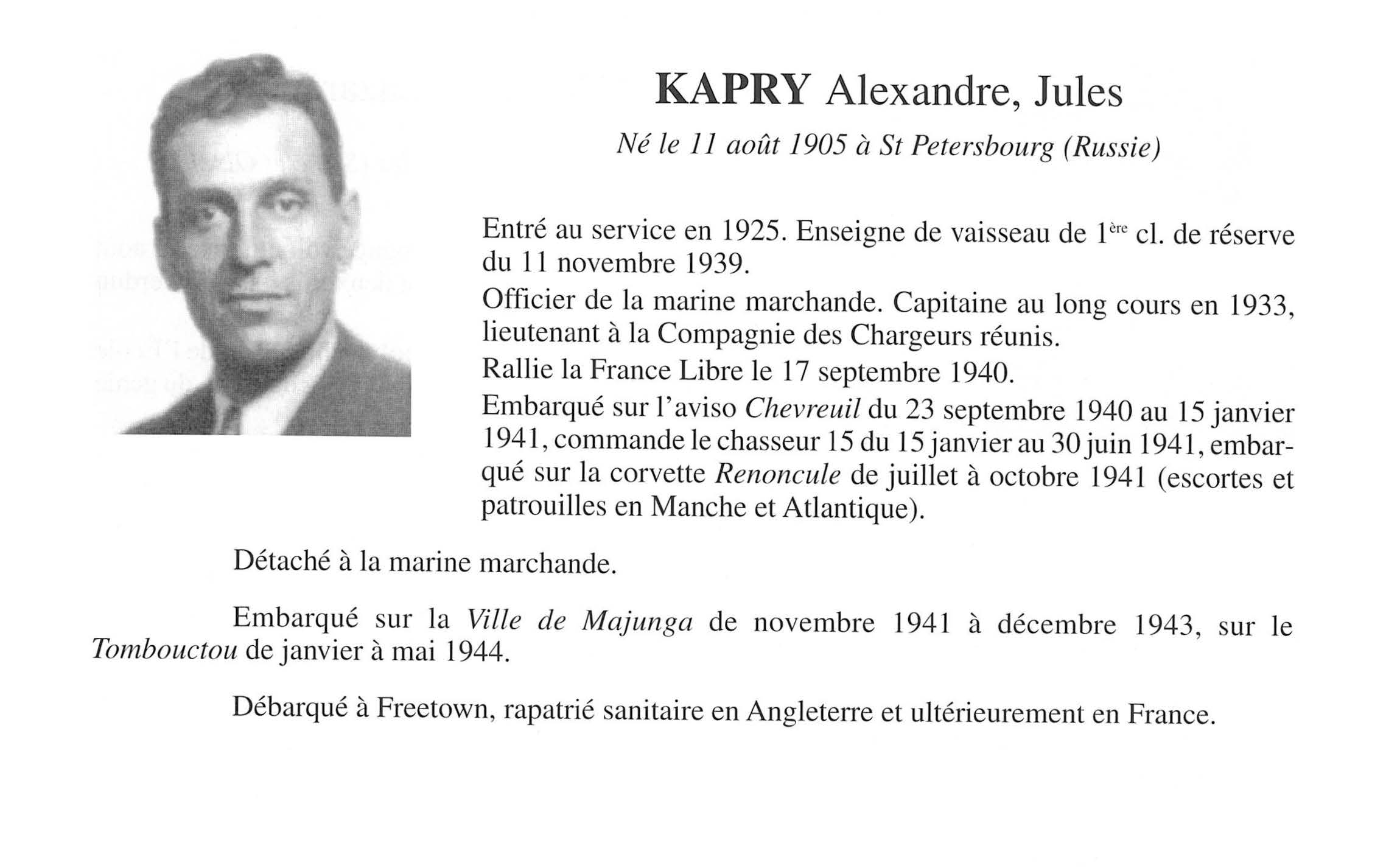 Le capitaine au long cours Alexandre Kapry était lieutenant à bord du paquebot Aurigny des Chargeurs Réunis, lorsqu'il fut porté déserteur de son bâtiment le 23 août 1940 à Buenos Aires (Argentine). L'Aurigny était immobilisé depuis le 6 juillet 1940 à Buenos Aires en raison de l'armistice.