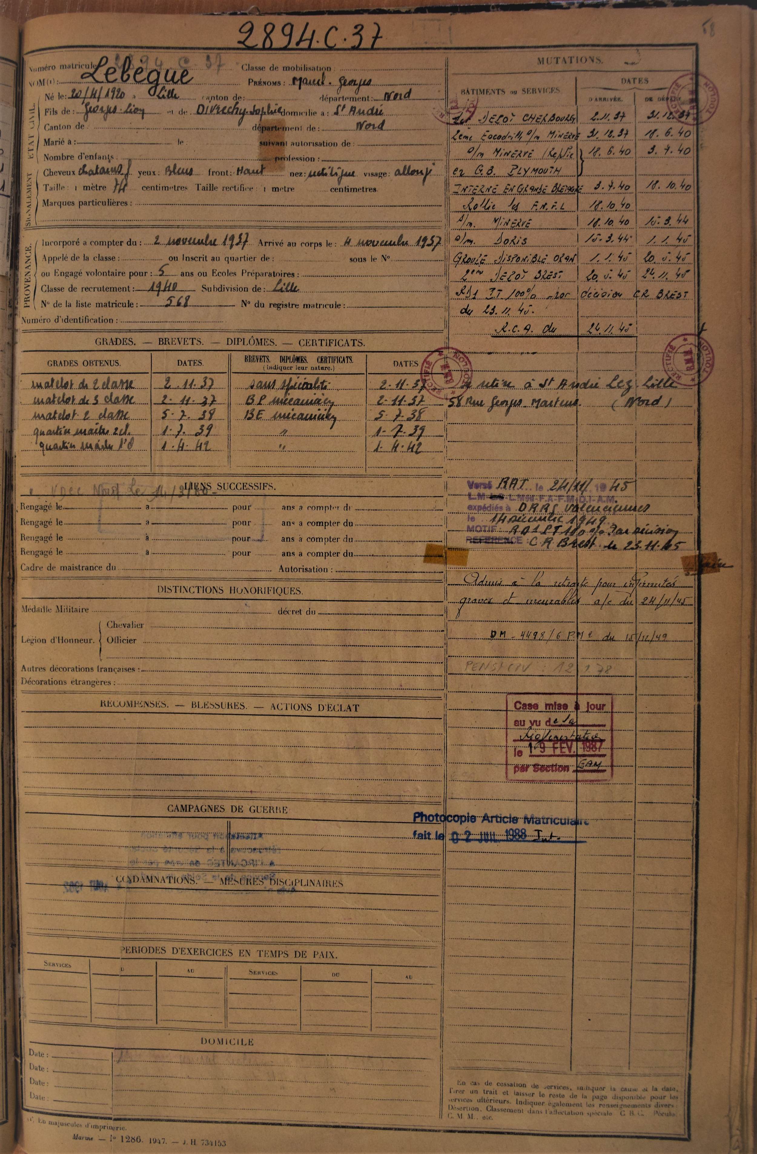 Il semble que Marcel Lebègue ait été enregistré aux FAFL le 19 octobre 1940, avec le grade de quartier maître de 2ème classe et la spécialité de mécanicien sous le matricule 30.469, avant d'être reversé à la Marine.